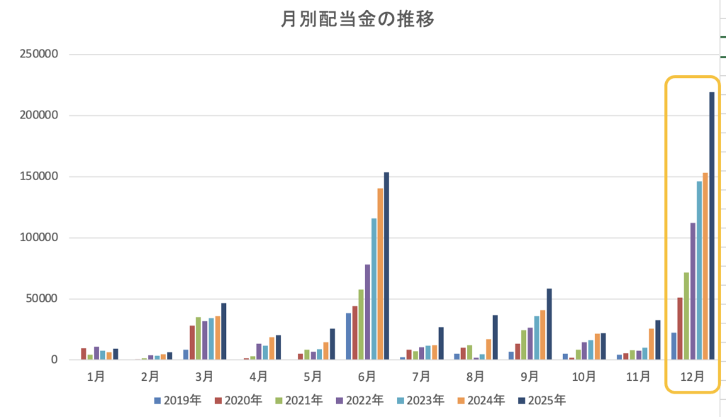 12月は配当金、給与、ボーナス、確定申告による還付含めて、毎年結構な額が貰えます。