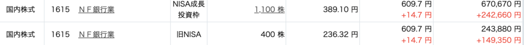 メガバンクも順調に上がっていますが、地方銀行もまだまだ上昇の余地があるんじゃないかと、勝手に予想しておりまして、NF銀行業を200株追加し、全部で1,500株になりました。